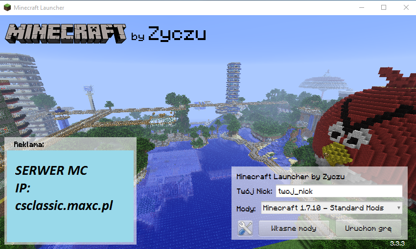 W miejscu "twoj_nick" wpisujemy nasz własny nick pod, którym będziemy rozpoznawani. Wybieramy wersje "Minecraft 1.7.10 - Standard Mods" i klikamy "Uruchom grę".